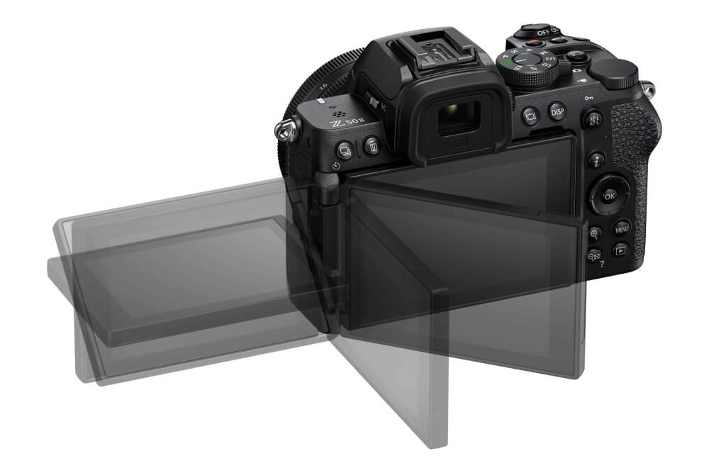 Eine weitere Änderung, die auf den ersten Blick auffällt, ist, dass der LCD-Monitor der Nikon Z50 II nicht mehr nach oben und unten klappbar ist, sondern an einem schwenkbaren Gelenk befestigt ist – ähnlich wie bei anderen Nikon-Modellen. Hier lässt sich schwer eine klare Bewertung abgeben, da einige das vorherige Befestigungssystem bevorzugen, während andere das neue mit dem Gelenk besser finden. Persönlich bevorzuge ich die neue Variante, unter anderem weil beide zwar ermöglichen, das Display nach vorne zu drehen (z. B. für Selfies), dies beim alten System jedoch nicht möglich war, wenn die Kamera auf einem Stativ montiert war. Ansonsten blieb der LCD-Monitor im Wesentlichen unverändert: Er hat eine Diagonale von 3,2" (8 cm), ist berührungsempfindlich und bietet eine Auflösung von ca. 1 Megapixel – Werte, die in dieser Kameraklasse völlig in Ordnung sind.