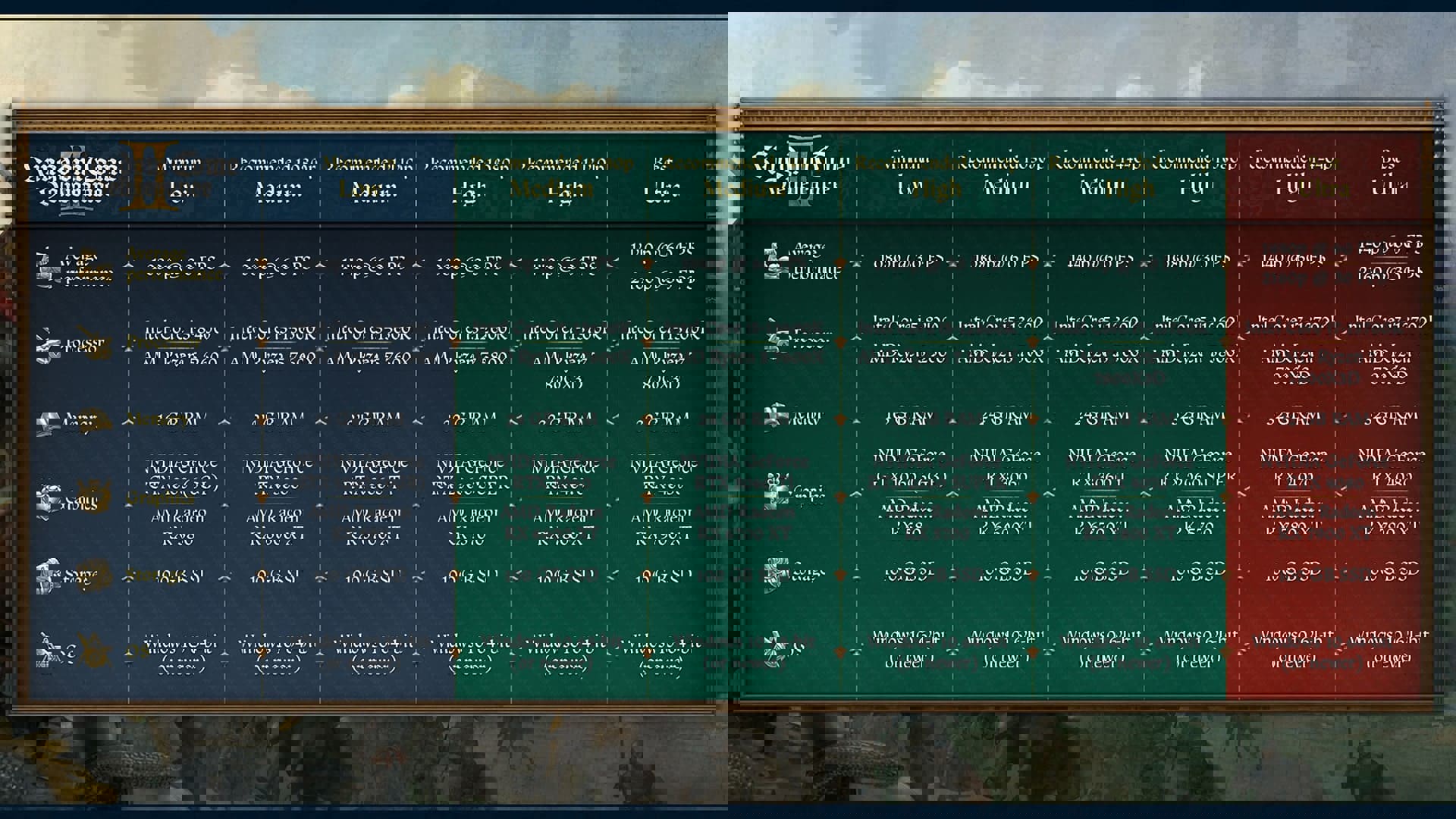 Zu den detaillierten HW-Anforderungen fügten die Entwickler auch eine ausführliche Anleitung bei, wie Spieler ihre PC-Konfiguration ermitteln konnten, ebenso wie Informationen zu den einzelnen Komponenten und deren konkreter Rolle beim Spielen von Kingdom Come: Deliverance 2. Die PC-Anforderungen wurden für insgesamt sechs Voreinstellungen veröffentlicht, wobei man bei den niedrigsten Einstellungen (1080p und 30 fps) mit einem Prozessor Intel Core i5-8400/AMD Ryzen 5 2600, einer Grafikkarte NVIDIA GeForce GTX 1060/AMD Radeon RX 580 und 16 GB RAM auskam.